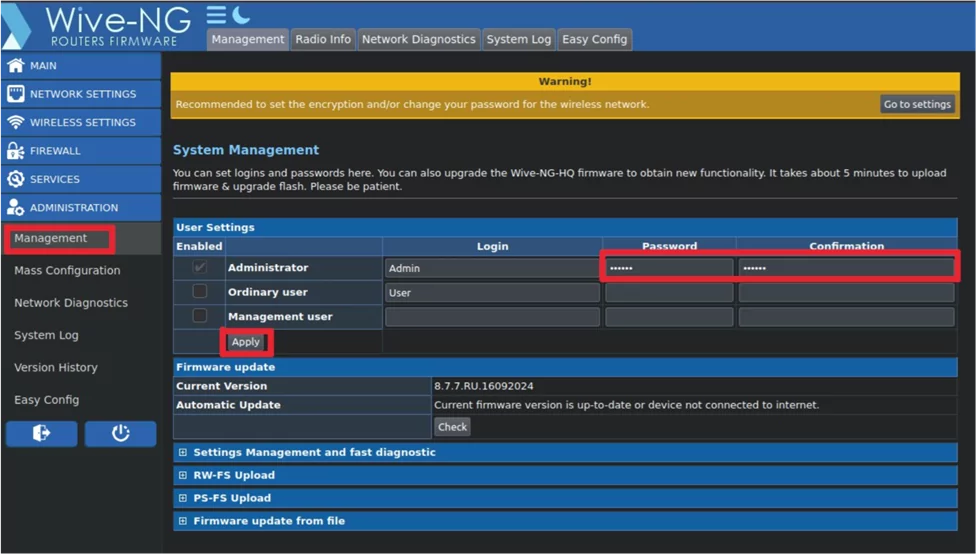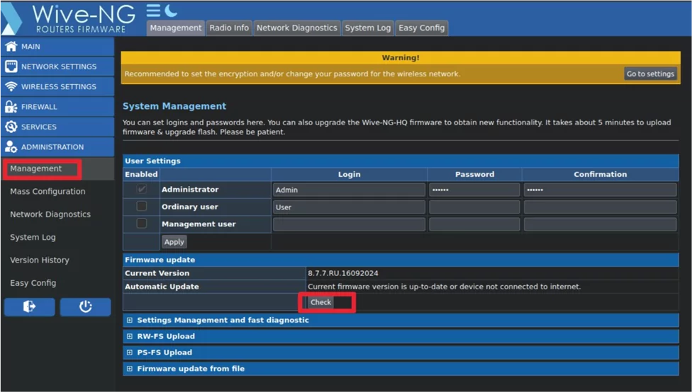 Administration -> Management -> Firmware update -> check -> install -> ждём пока загрузится и установится прошивка(не отключаем питание роутера).