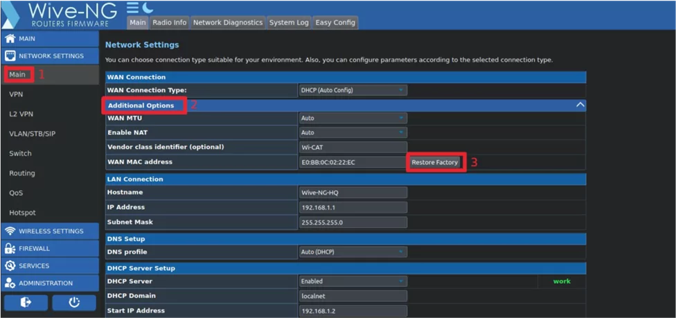 Network Settings -> Main -> WAN MAC address -> Restore Factory