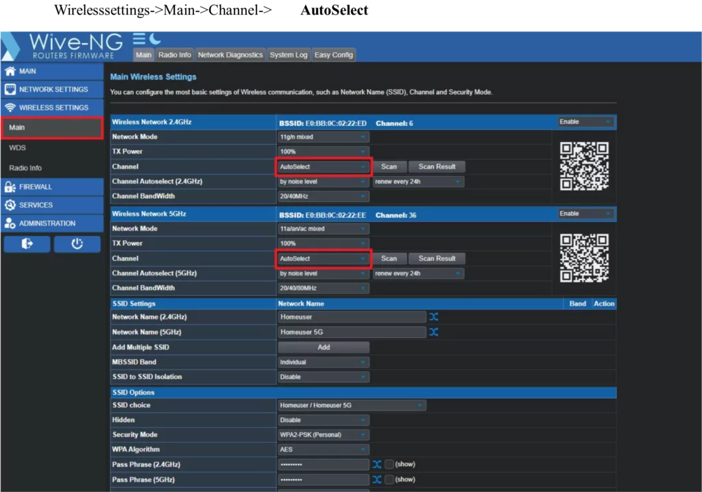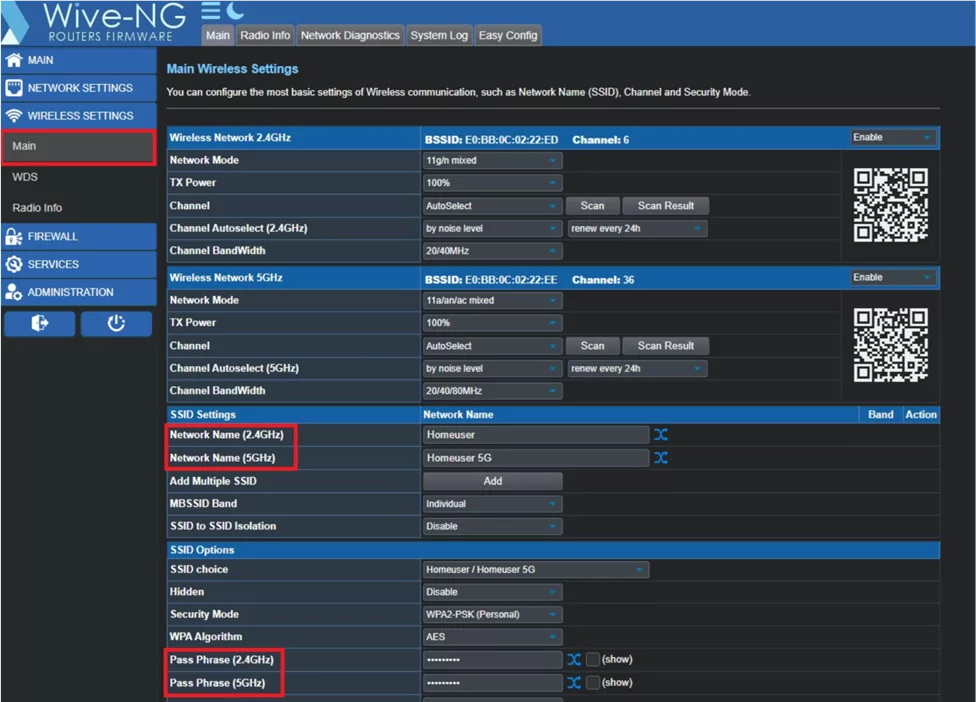 8. Меняем название сетей wi-fi и пароли: Wireless settings -> Main -> Network Name и Pass Phrase