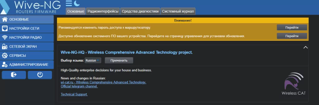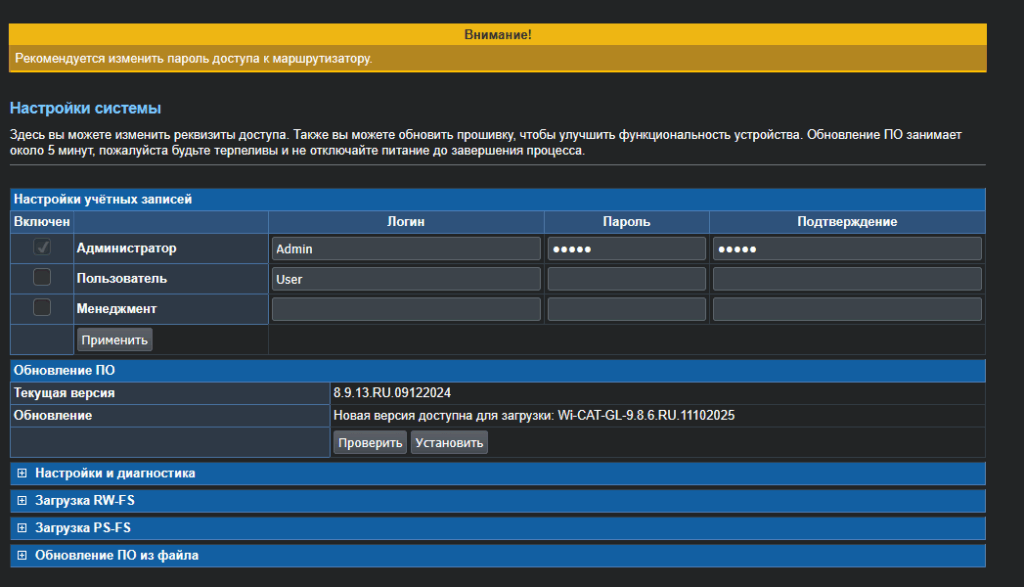 Далее необходимо обновить программное обеспечение (ПО) на роутере и по желанию сменить пароль панели администратора.