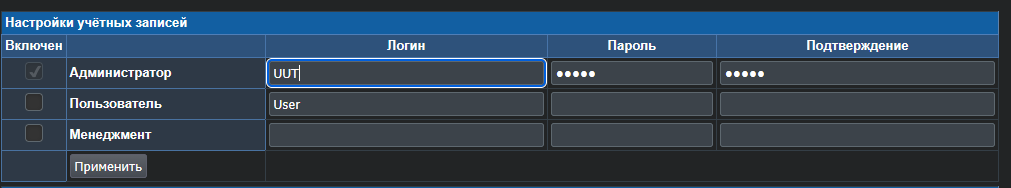 11. Теперь мы можем поменять логин и пароль для входа в панель администратора в панели «Настройки учётных записей», нажимаем «Применить».